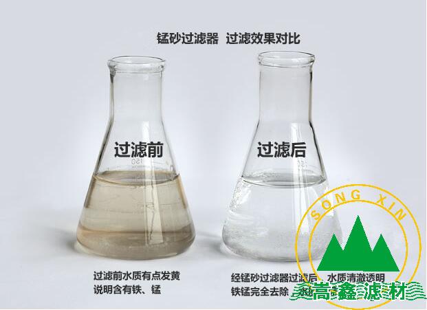 天然錳砂濾料是一種良好的天然氧化劑,它能有效的將水中二氧化錳能氧化水中二價(jià)鐵為三價(jià)鐵使其沉淀除去,二氧化錳被水中的溶解氧氧化成七價(jià)錳的氧化物。用于地下水除鐵和除錳的天然錳砂濾料,其錳的形態(tài)應(yīng)以氧化錳為主。含錳量(以MnO2計(jì),下同)不應(yīng)小于35%的天然錳砂濾料,既可用于地下水除鐵,又可用于地下水除錳;含錳量為20%~30%的天然錳砂濾料,只宜用于地下水除鐵;含錳量小于20%的錳礦砂則不宜采用。宜優(yōu)先采用經(jīng)過(guò)科學(xué)試驗(yàn)或生產(chǎn)使用證明能獲得良好除鐵和除錳效果的天然錳砂品種作濾料。
