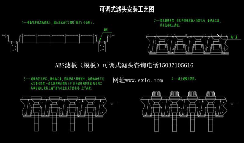 水廠濾池氣水反沖洗濾池常用的濾板有預(yù)制濾板和現(xiàn)澆整體濾板兩種:濾頭分為固定式和可調(diào)式兩種.固定式適應(yīng)于預(yù)制濾板:可調(diào)式長柄濾頭特別適應(yīng)于現(xiàn)澆濾板.也適應(yīng)于預(yù)制濾板.QSK-ll型可調(diào)式長柄濾頭原料采用高強度ABS顆粒樹脂(簡稱ABS工程塑料)經(jīng)高溫熱溶由精密磨具成型?烧{(diào)式濾頭主要用:濾帽、濾桿、預(yù)埋座組成,濾桿上設(shè)有調(diào)節(jié)螺紋,可供上下調(diào)節(jié);且設(shè)有調(diào)節(jié)瓣與預(yù)埋座內(nèi)調(diào)節(jié)瓣防脫條結(jié)合,可控制濾桿調(diào)節(jié)精度,同時固定其位置。